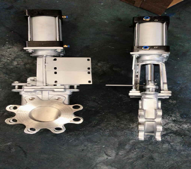 气动刀型闸阀主要有左、右阀体、U型密封圈、闸板、钢螺母、阀杆、支架、气缸等件组成,阀门启闭靠气缸动作来完成。